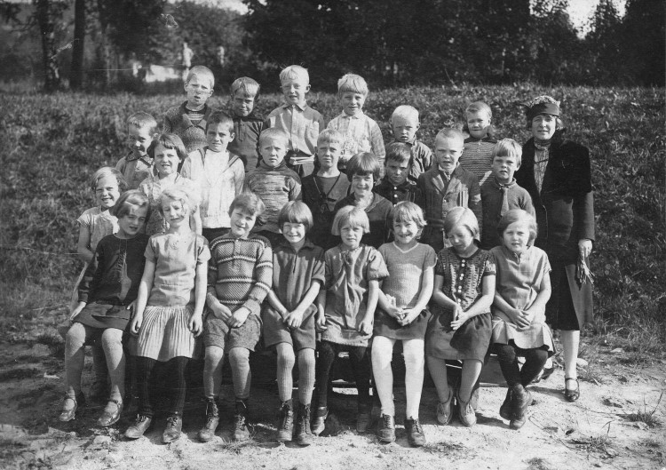 Læreren på bildet er Rasmus Bakke, og min mor Borghild Hansen er i første rekke nummer fire fra venstre. Jenta i andre rekke nummer én fra høyre het Odny Gundersen og kom fra Midtodden gård, og hun gikk barbeint store deler av veien. Hun hadde sko liggende under en stein der hvor Osebakken kommer ned, da hun ikke fikk lov til å slite ut skoene på den steinete veien inn til skolen.